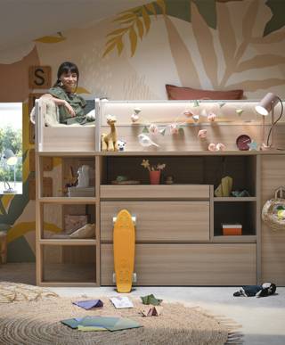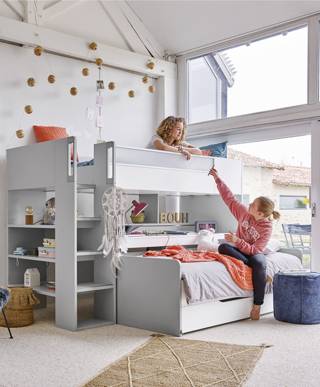 Quand il est question de choisir des solutions de rangement pour une chambre d’enfant, mille possibilités sont offertes ! Cependant, gardez en tête que si l’espace est réduit, le seul mot d’ordre est l’optimisation ! Mieux vaut en effet miser sur des meubles compacts, permettant d’associer plusieurs fonctions à la fois. C’est le cas des lits « gain de place » qui combinent à la fois couchage, bureau et rangements.